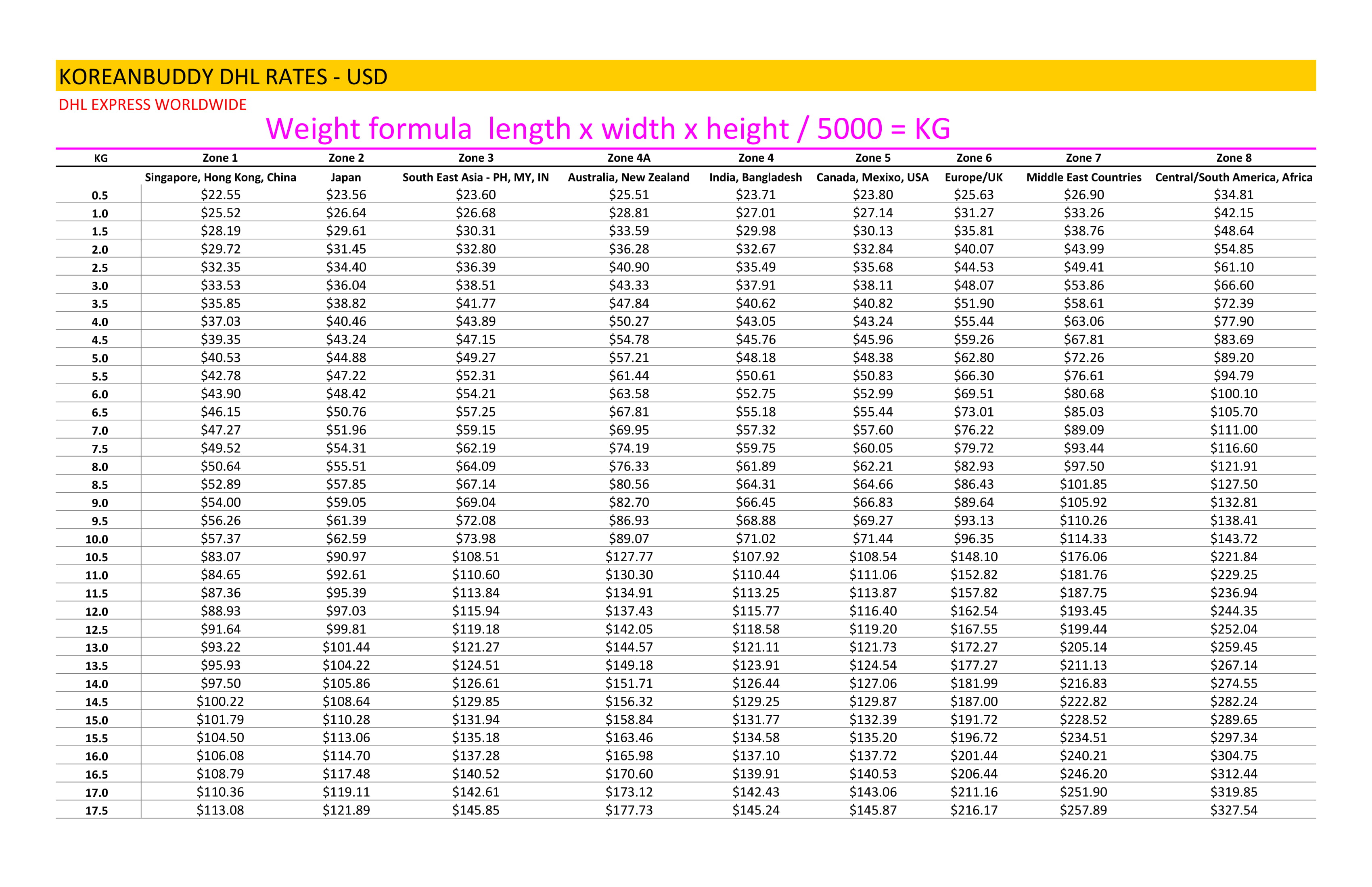 | 10Kg | $32.37 | $33.80 | $40.93 | $48.05 |