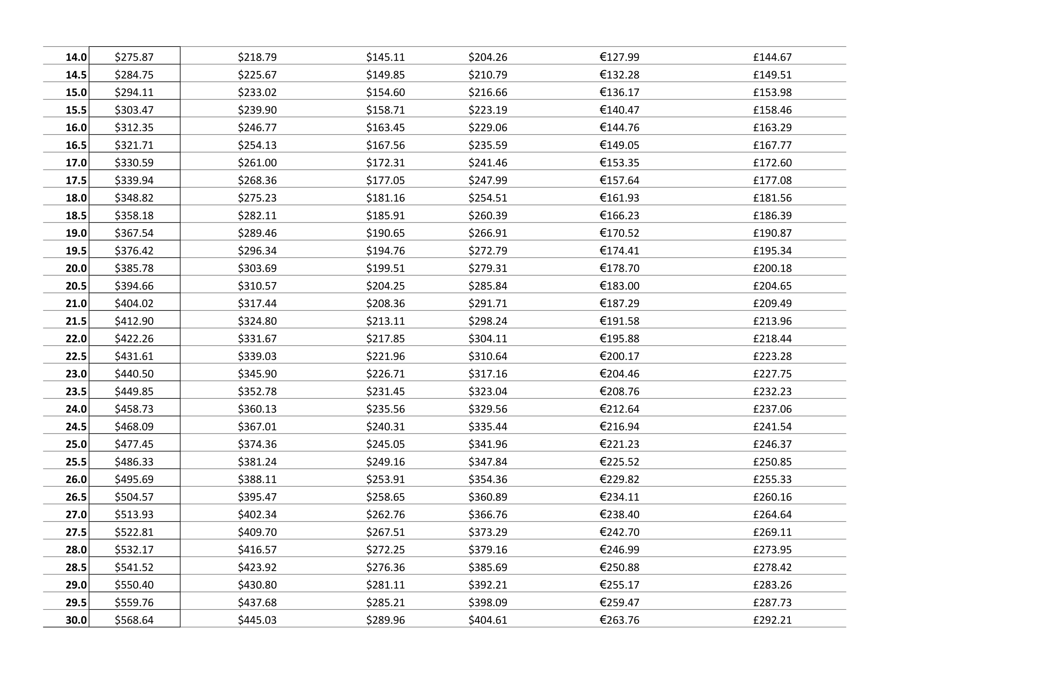 | 14Kg | $40.94 | $42.37 | $52.82 | $62.82 |
