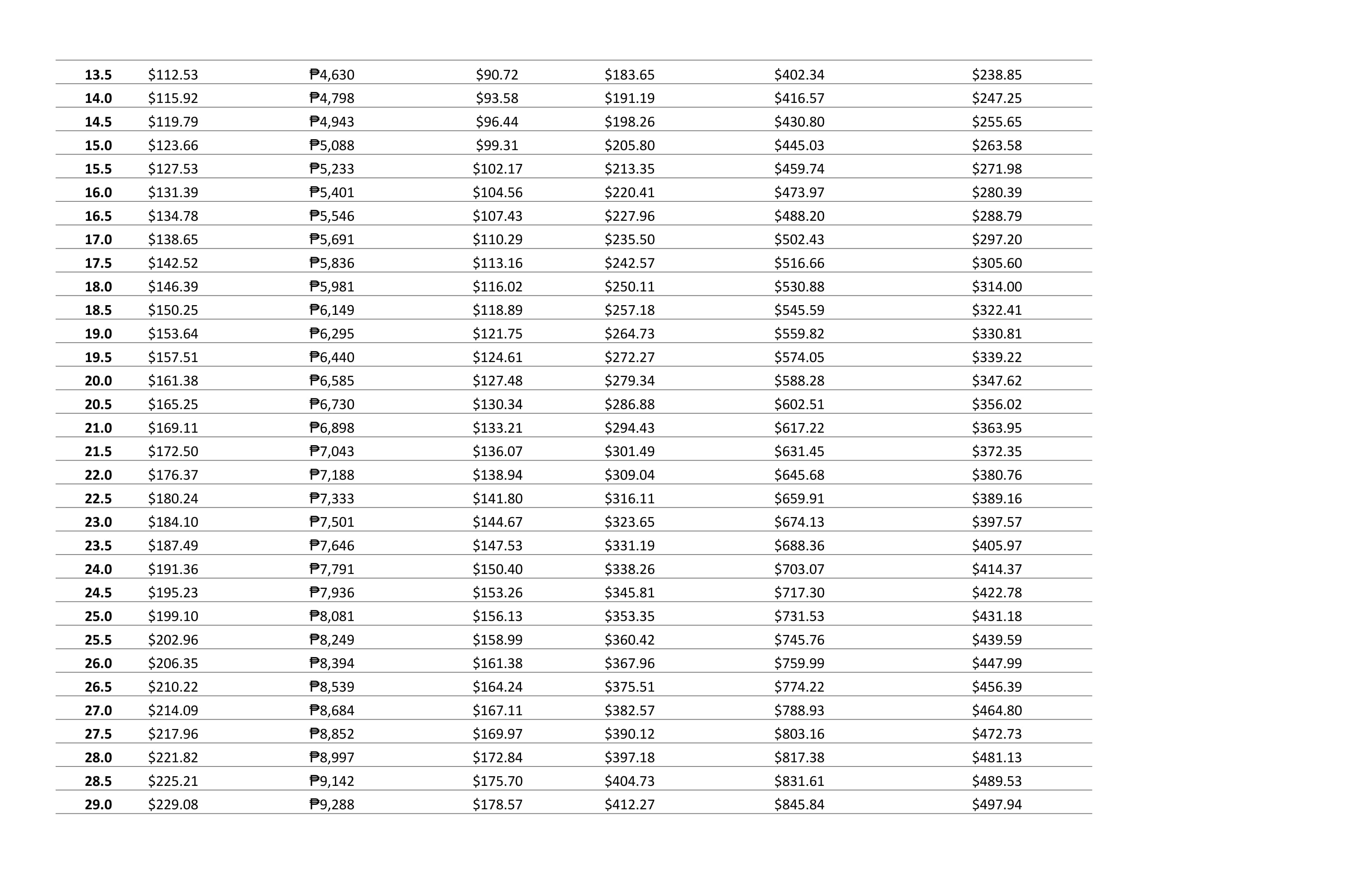 | 6Kg | $23.32 | $24.75 | $29.00 | $33.80 |